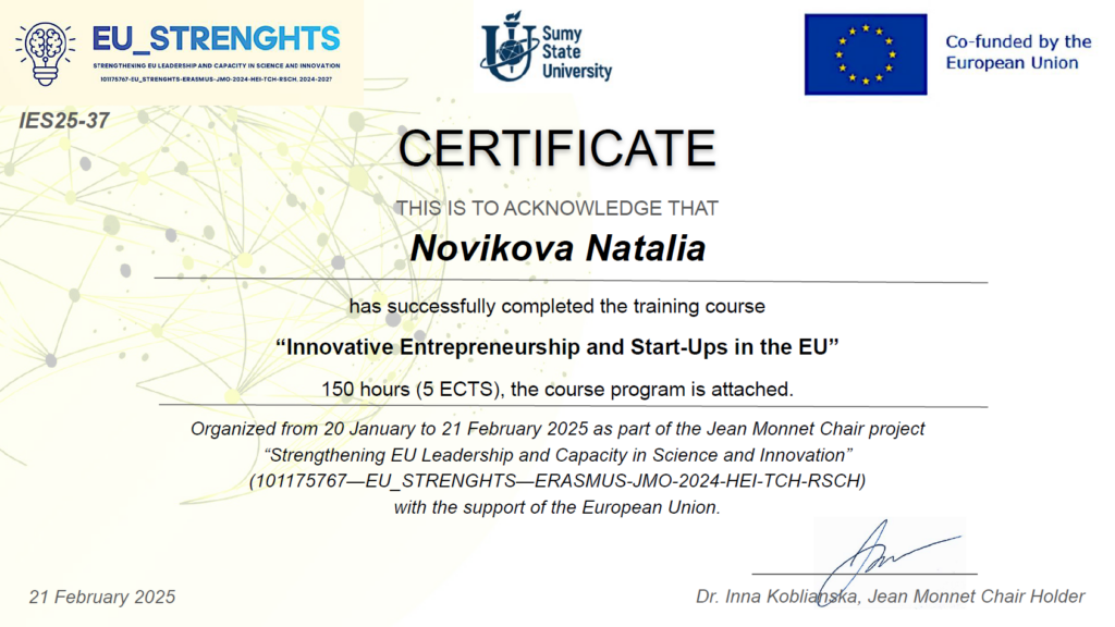 20 січня – 21 лютого 2025 року викладачі кафедри менеджменту та маркетингу Київського національного лінгвістичного університету взяли участь у курсі «Інноваційне підприємництво та стартапи в ЄС» (5 ECTS), який організовано в межах виконання проєкту Кафедра Жана Моне «Зміцнення лідерства та спроможності ЄС у сфері науки та інновацій» (101175767—EU_STRENGHTS—ERASMUS-JMO-2024-HEI-TCH-RSCH) на 2024-2027 роки.
