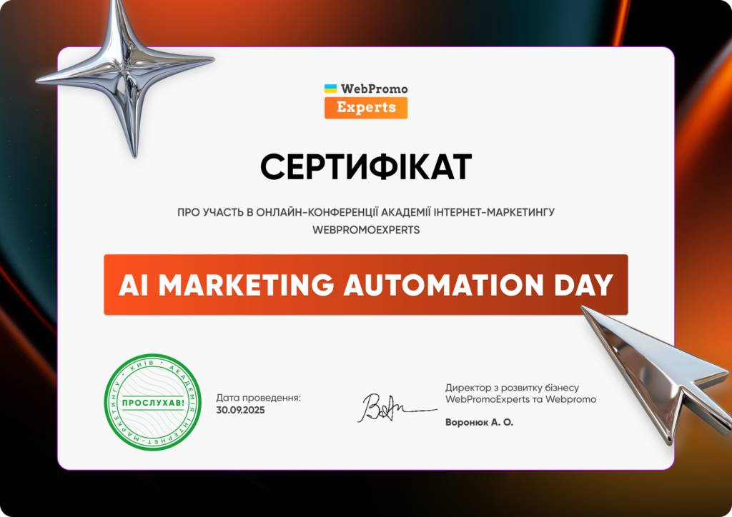 Підтвердженням відвідування даної події стали сертифікати, які були надані всім слухачам онлайн-конференції AI Marketing Automation Day.