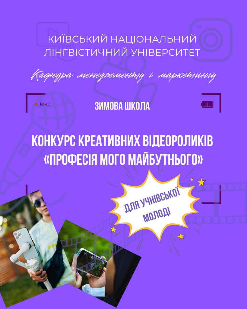 Кафедра менеджменту і маркетингу КНЛУ запрошує учнів 9-11 класів проявити креативність і взяти участь у конкурсі відеоробіт. 💫 Це можливість для учнів подумати над вибором професії та спробувати себе у ролі контент-мейкера.