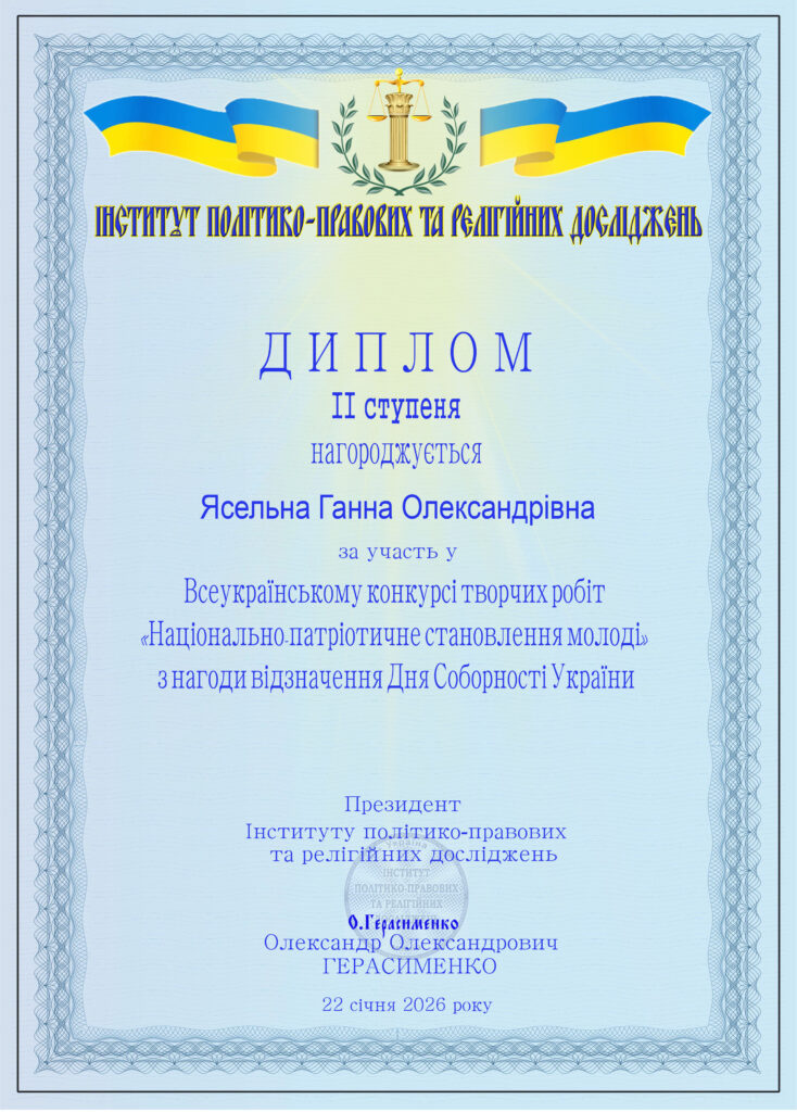 Конкурс став майданчиком для висвітлення глибоких роздумів, креативних ідей та щирого патріотизму. Робота Ганни Ясельної отримала високу оцінку експертного журі за актуальність, змістовність та непересічний підхід до висвітлення теми національної самосвідомості.