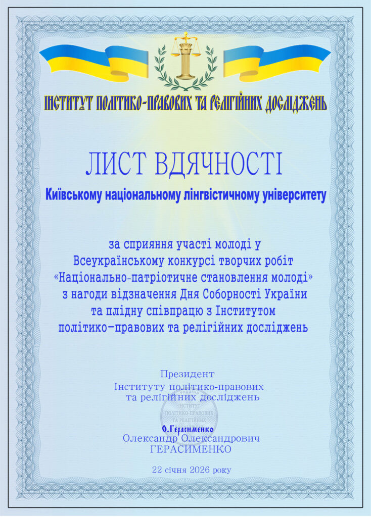 З нагоди Дня Соборності України Інститутом політико-правових та релігійних досліджень було проведено Всеукраїнський конкурс творчих робіт «Національно-патріотичне становлення молоді». Це свято єдності та державності цьогоріч відзначилося не лише урочистими заходами, а й високими досягненнями нашої талановитої молоді.